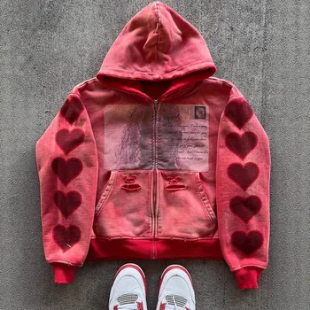 Casual Zip-Up Hoodie and Pants Set Printed Patches Distressed Holes Winter Hip-Hop Jacket with Zipper